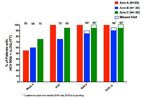 ); "The end of treatment response (HCV RNA <LLOQ) was 100%, 75% and 95% of subjects in Arms A, B and C respectively using a more sensitive HCV assay with lower limit of quantification of 12 IU/mL (Fig 1). Using an HCV RNA assay with a lower limit of quantification of <43 IU/mL 100% of patients on all arms were suppressed at EOT. 100%, 90% and 95% of patients in Arm A, B and C respectively achieved SVR12."