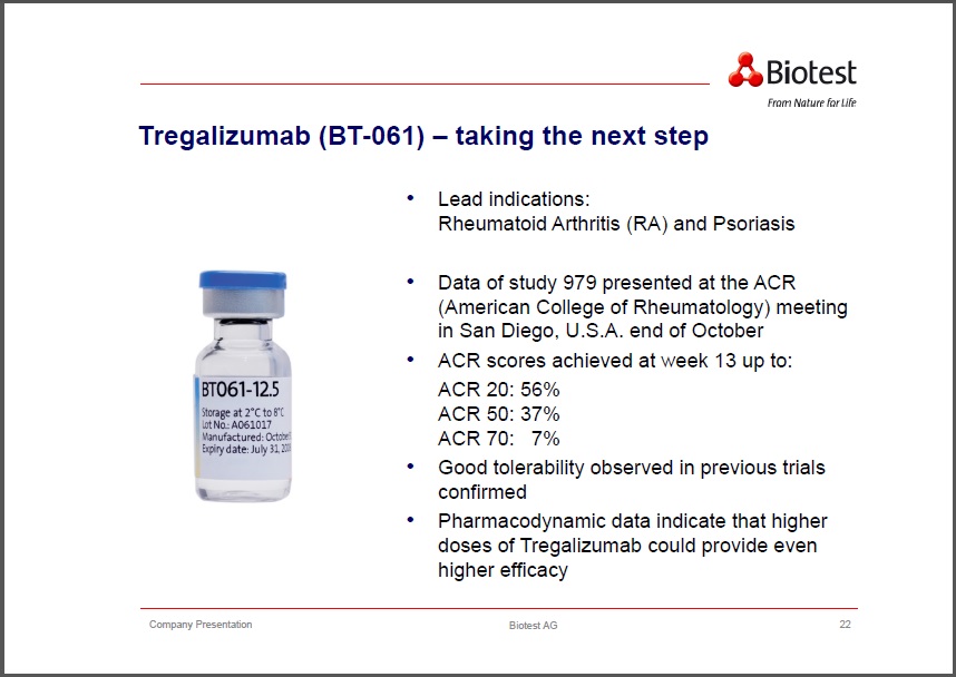P2, N=176; NCT01481493; Sponsor: Biotest; "Biotest AG today announced the presentation of efficacy and safety results from the Phase II study '979' at the Annual Meeting of the American College of Rheumatology (ACR) in San Diego, United States....ACR 20 responses (improvement of disease activity by at least 20%) were observed in up to 56% of patients treated with tregalizumab, and up to 37% and 7% of patients had improvements of disease activity of 50% (ACR 50) or 70% (ACR 70) respectively. The good tolerability of tregalizumab (BT-061) observed in previous trials was also confirmed in this trial; P2b, N=300; TREAT 2b; "The target recruitment for this clinical trial is more than 300 patients....The treatment of the first patients will start within the next days."