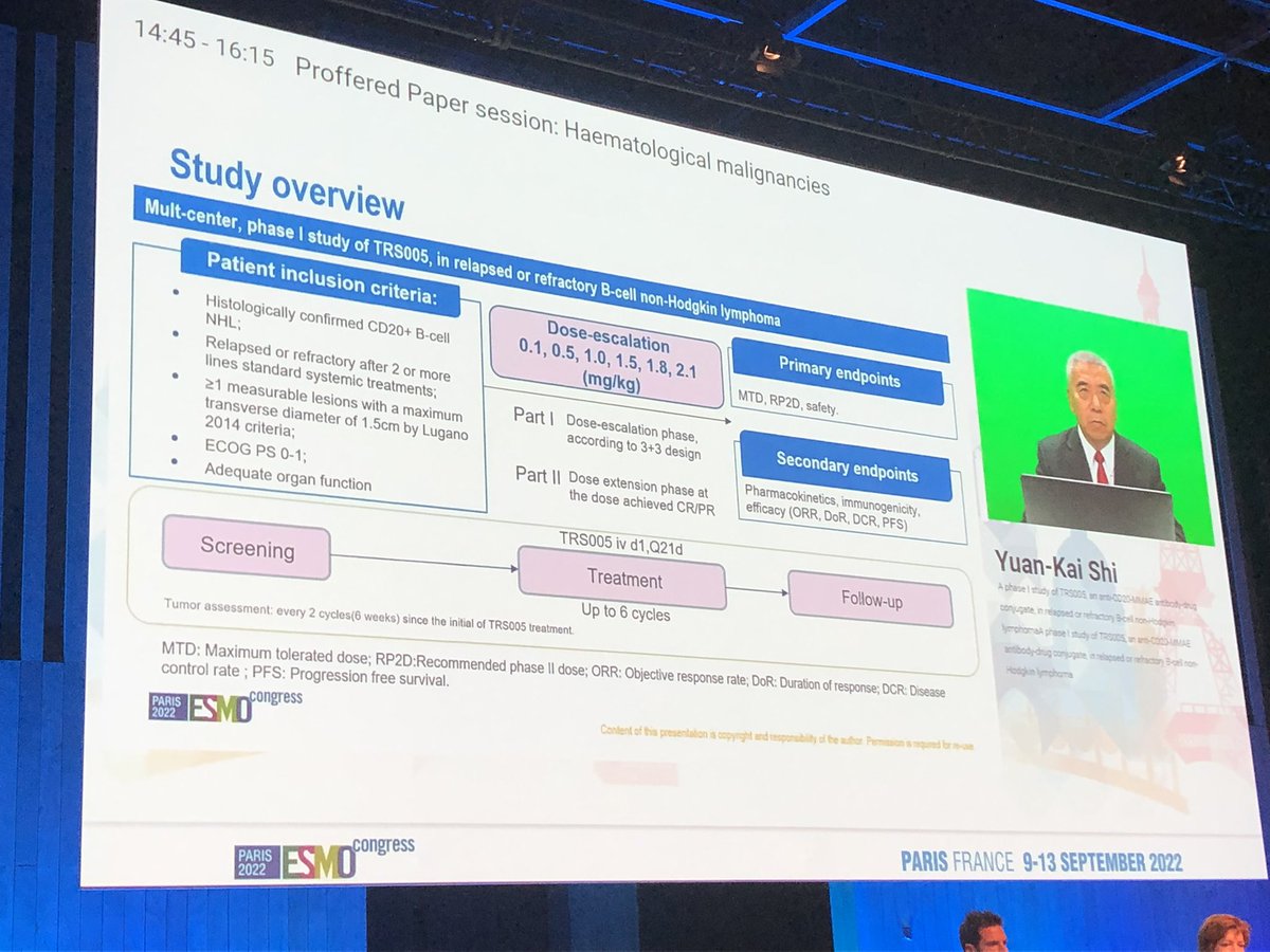 "CD20+ R/R B-cell NHL | Phase I study of TRS005 (an anti-CD20-MMAE ADC) mPFS 4 months #ESMO22"