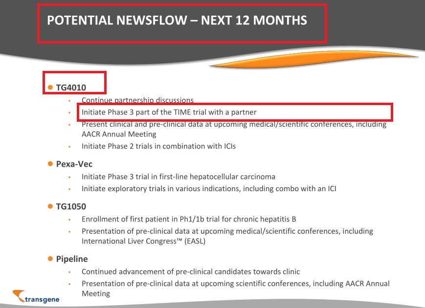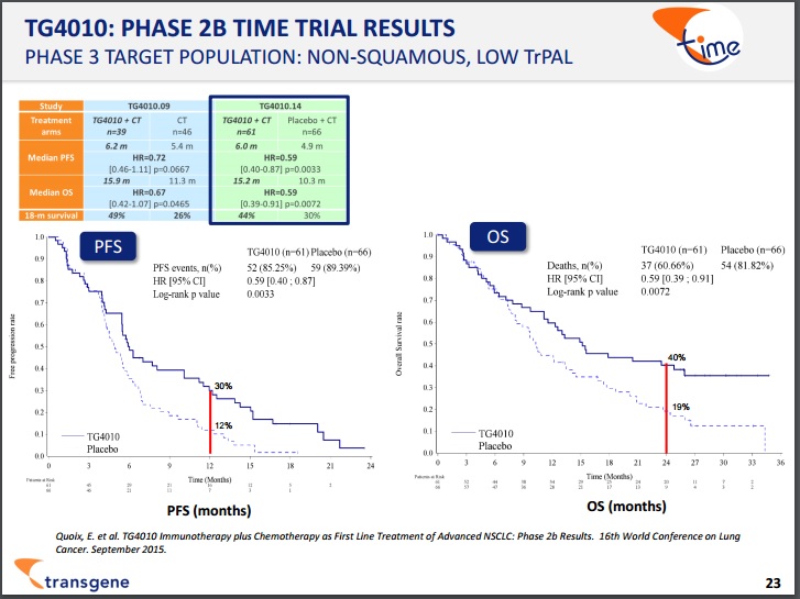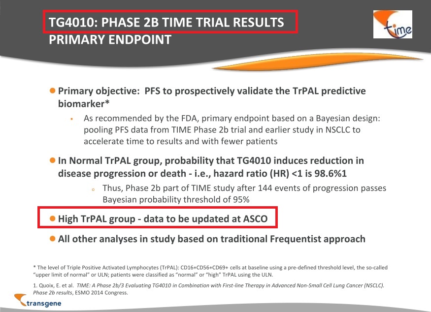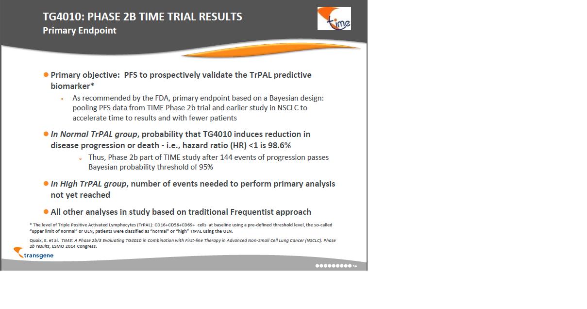 - “TG4010: PHASE 2B TIME TRIAL RESULTS”; “Primary objective: PFS to prospectively validate the TrPAL predictive biomarker: As recommended by the FDA, primary endpoint based on a Bayesian design: pooling PFS data from TIME Phase 2b trial and earlier study in NSCLC to accelerate time to results and with fewer patients”; “In Normal TrPAL group, probability that TG4010 induces reduction in disease progression or death - i.e., hazard ratio (HR) <1 is 98.6%: Thus, Phase 2b part of TIME study after 144 events of progression passes Bayesian probability threshold of 95%”; “In High TrPAL group, number of events needed to perform primary analysis not yet reached”; “All other analyses in study based on traditional Frequentist approach”
