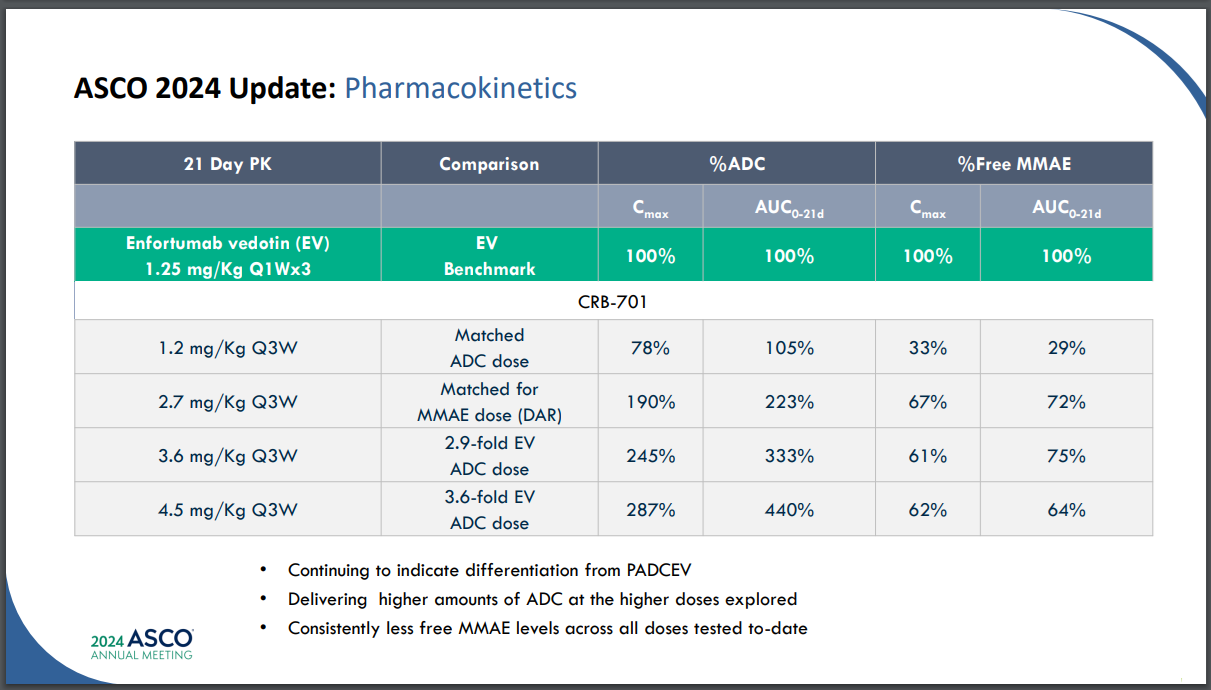 - P1/2 | "CRB-701, a next-generation nectin-4 targeted ADC, has third-generation linker technology that is specifically designed to reduce the dose-limiting toxicities (DLTs) reported with ADCs (e.g. enfortumab vedotin [EV]). PK, safety and efficacy observations are consistent with those from a previous study in Han Chinese patients. CRB-701 was well tolerated and, relative to EV at similar doses, demonstrated signs of a differentiated PK profile, including a longer half-life and lower free MMAE levels. CRB-701 development will continue to dose expansion."