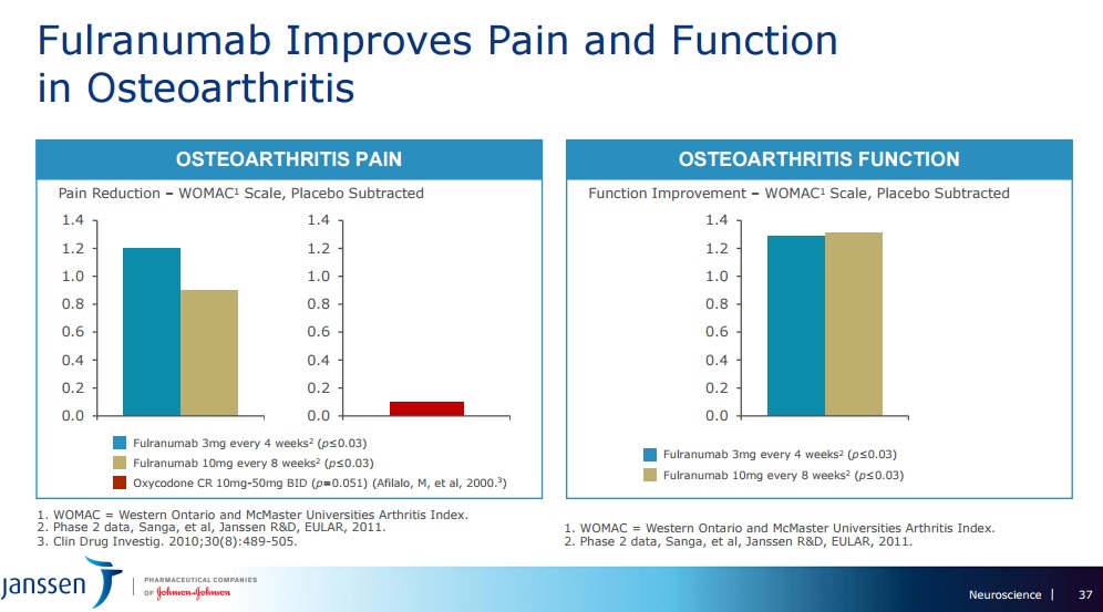 - P3 | "Within the limited sample analyzed, fulranumab showed evidence of improvement of pain and function in patients with moderate-to-severe osteoarthritis who had failed prior therapy and were candidates for joint replacement surgery. Fulranumab as adjuvant or monotherapy was well tolerated with no new safety signals Fulranumab demonstrated evidence suggestive of efficacy in osteoarthritic pain of hip and knee Fulranumab demonstrated evidence suggestive of improvement of pain and physical function in osteoarthritis."