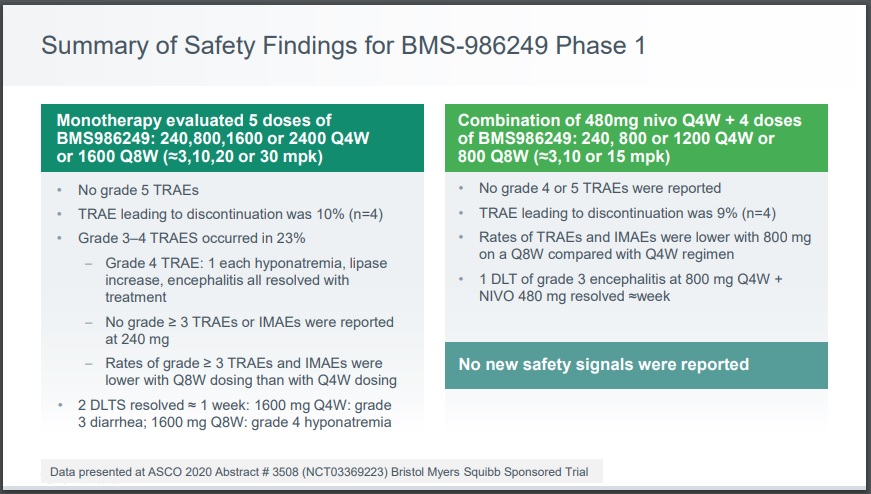 BMS-986249 + Opdivo + Yervoy: “The safety profile of BMS-986249 allowed for assessment of higher doses as monotherapy and in combination with full dose nivolumab than previously tested”; Solid tumors