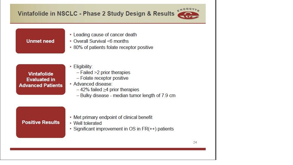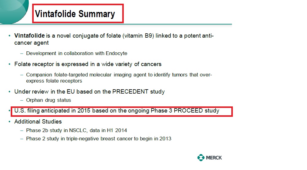 - Merck & Endocyte announce they have entered into an agreement to develop & commercialize Endocyte's novel investigational therapeutic candidate vintafolide (EC145); Vintafolide is currently being evaluated in a P3 clinical trial for platinum-resistant ovarian cancer, (PROCEED trial) & a P2 trial for cancer NSCLC