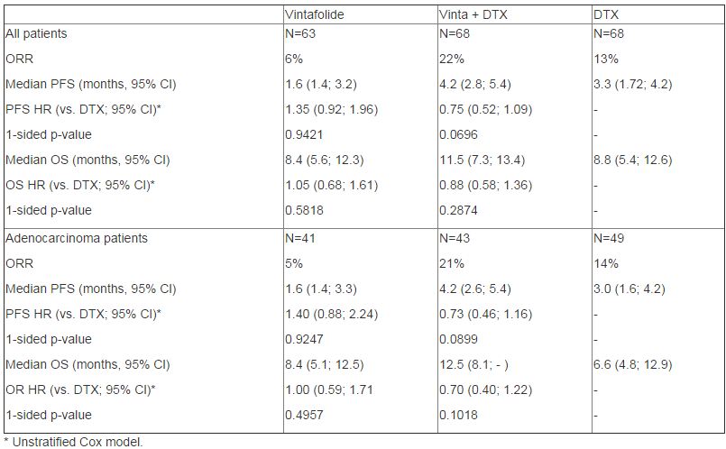 - Presentation time: 27.09.2014, 16:00 - 17:45; Abstract #LBA40_PR; P2, N=199; NCT01577654; Sponsor: Merck; "With the pre-specified stratified analysis adjusting for baseline factors (time since last chemotherapy, best response and stage), the OS HR for vintafolide+DTX vs. DTX were 0.75 (1-sided p=0.1066) for all patients, and 0.51 (1-sided p=0.0147) for the predefined adenocarcinoma patient subgroup....Vintafolide+DTX showed clinically meaningful improvement across all efficacy endpoints (ORR, PFS and OS) over single-agent DTX,...."