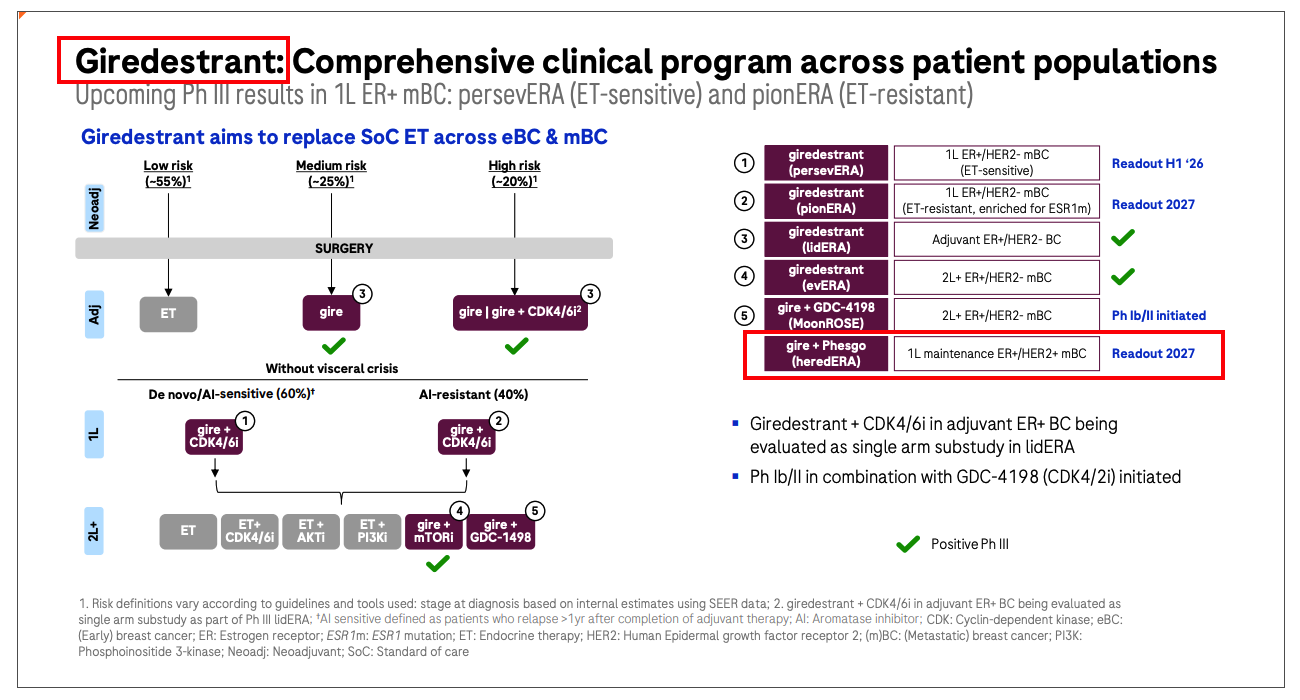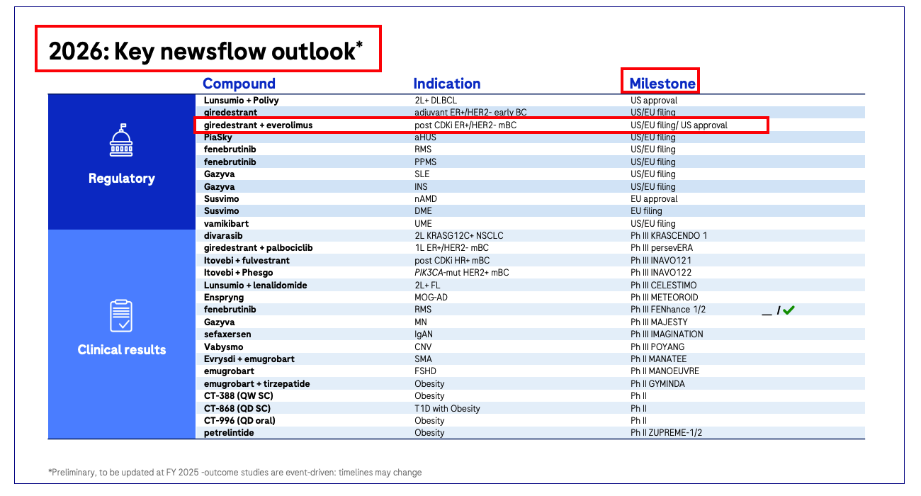 Giredestrant: Regulatory submissions in US/EU for post CDKi ER+/HER2- metastatic breast cancer (in combination with everolimus) in 2026