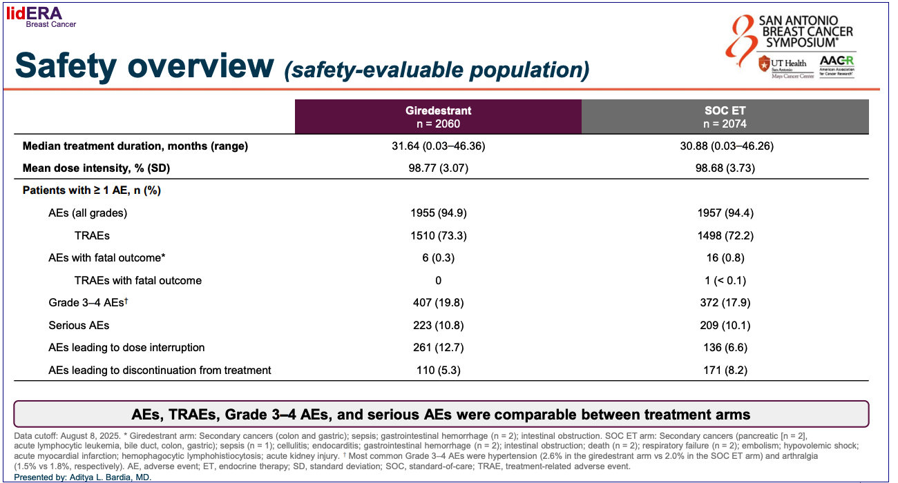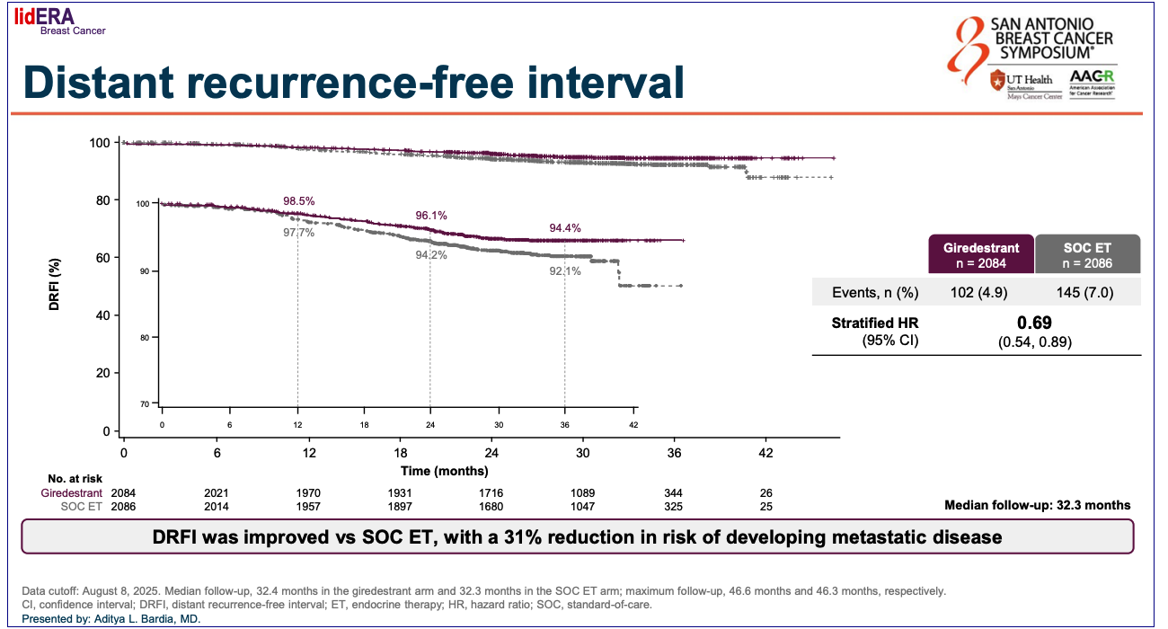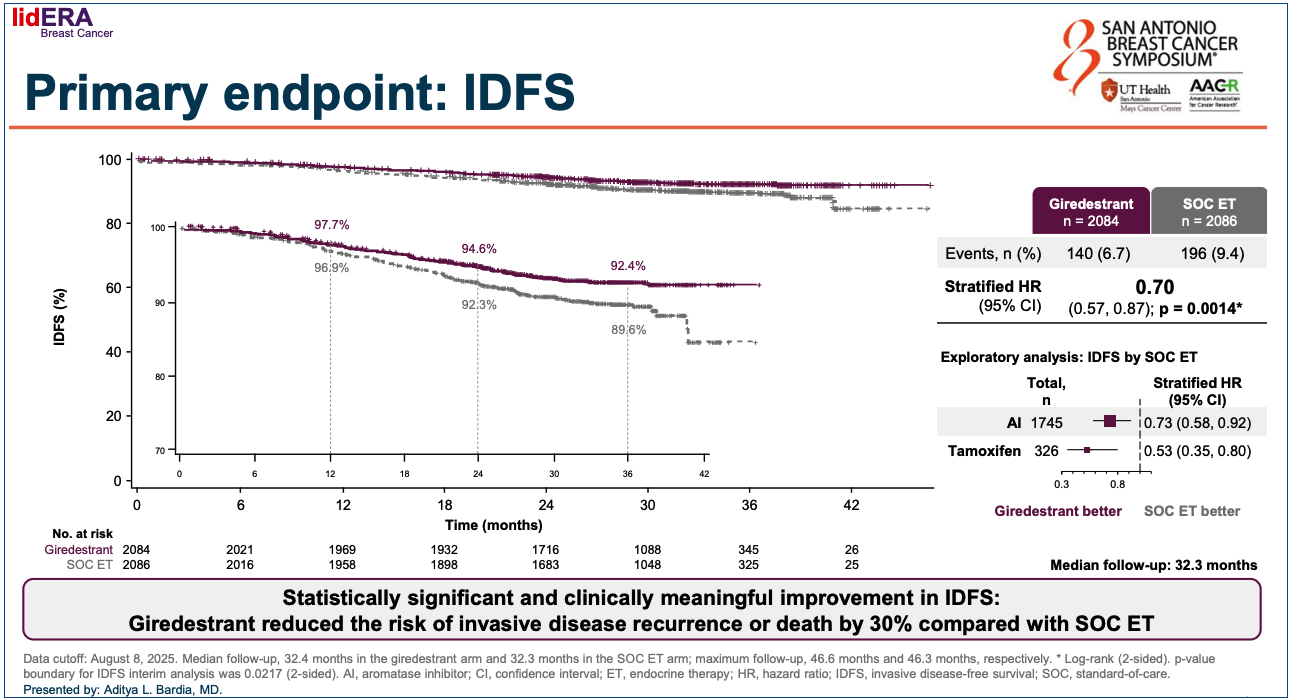 - SABCS 2025: "IDFS hazard ratio: 0.70 (95% CI: 0.57, 0.87; p = 0.0014); 3-year IDFS rates: 92.4% vs 89.6%."