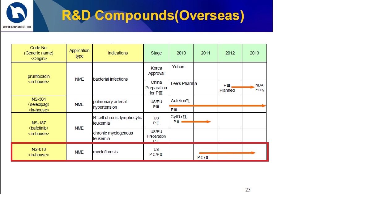 - "NS Pharma...announced that the U.S. FDA has granted Orphan Drug Designation to NS-018 (ilginatinib), an investigational treatment for myelofibrosis (MF), a rare and incurable blood cancer.....NS-018 is a highly selective and potent inhibitor of JAK2 developed by scientists from Nippon Shinyaku."