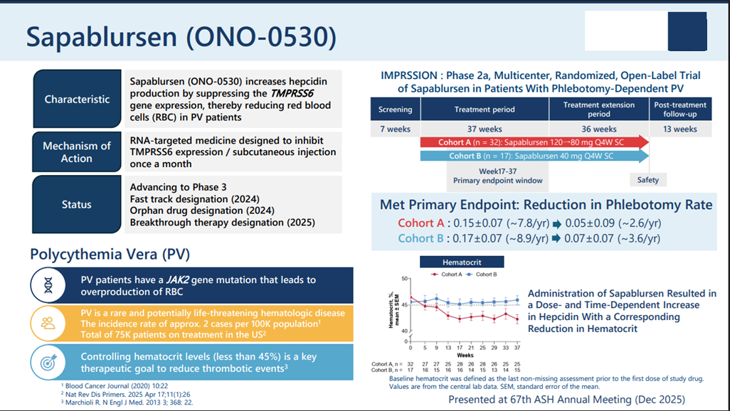 Sapablursen: “Met primary endpoint: Reduction in phlebotomy rate”; Polycythemia vera