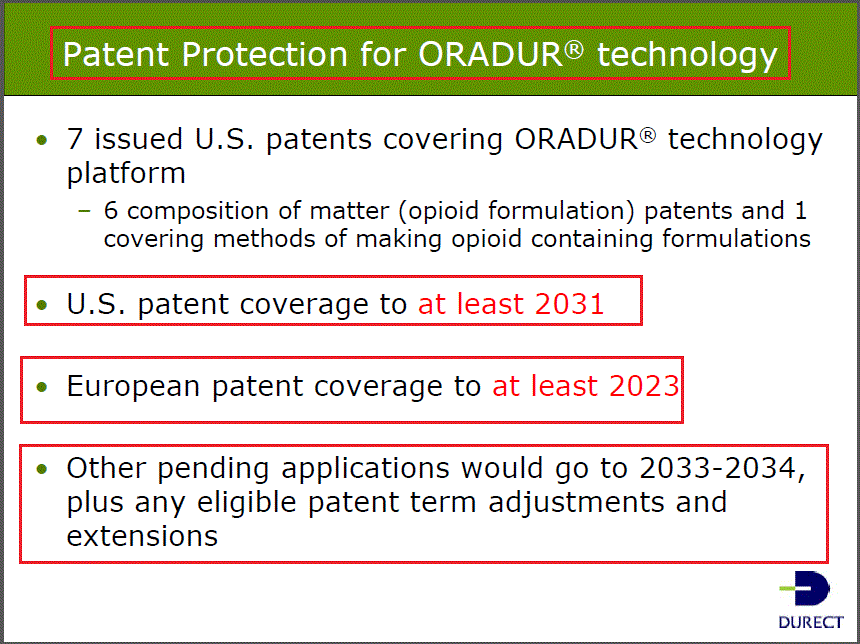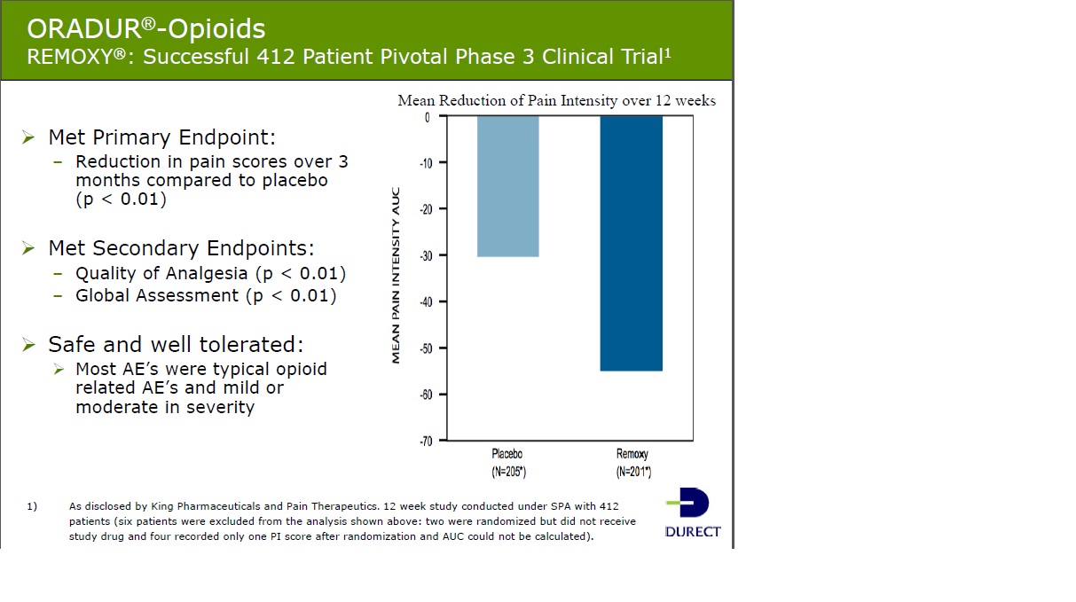 - "We note the recent additional patent issuance extending coverage of REMOXY in the U.S. to at least 2031...DURECT has two transdermal products...TRANSDUR®-Sufentanil...ELADUR®...We are in discussions with potential partners regarding licensing development and commercialization rights to these two transdermal programs for which we hold worldwide rights."