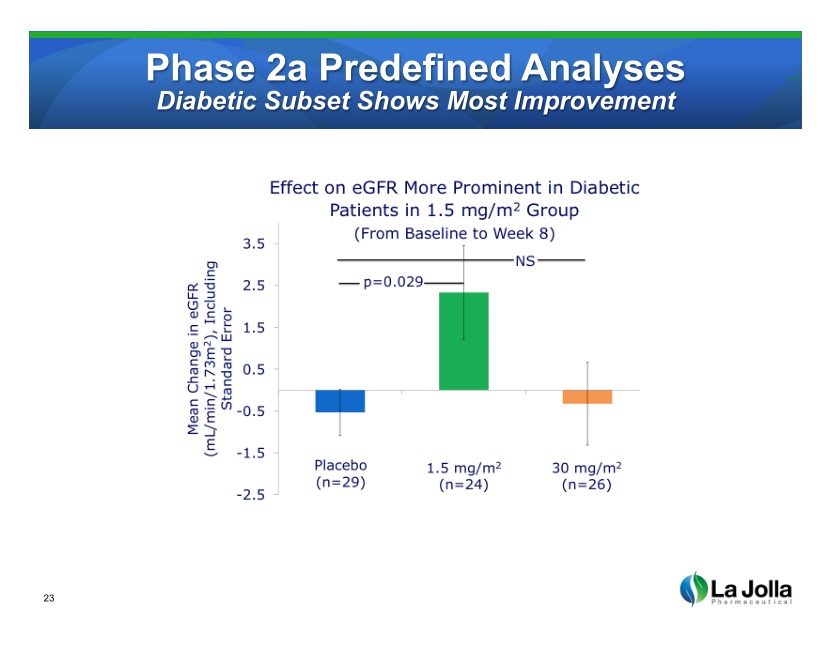 - P2a, N=121; Sponsor: La Jolla Pharmaceutical; NCT01843790; "The trial met its primary efficacy endpoint of a statistically significant improvement in kidney function. Specifically, a dose of 1.5 mg/m2 led to a statistically significant (p=0.045) increase in estimated glomerular filtration rate (eGFR) compared to placebo between baseline and end of treatment. At the 30 mg/m2 dose, there was no statistically significant difference."