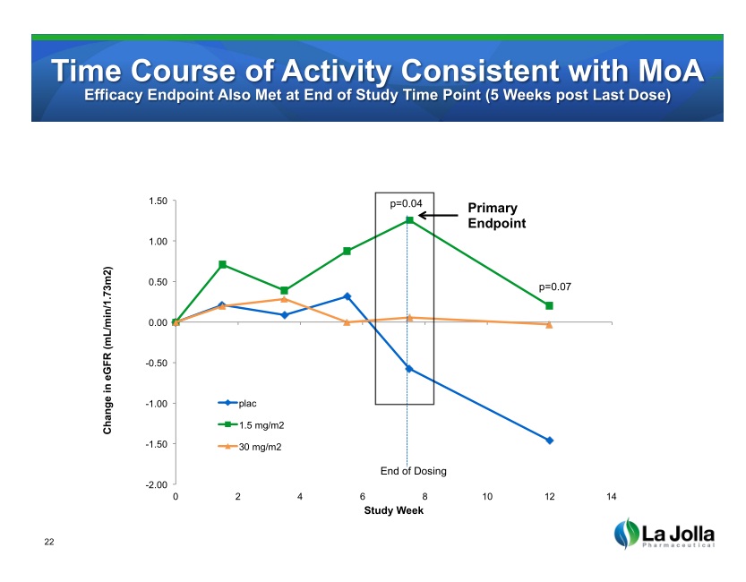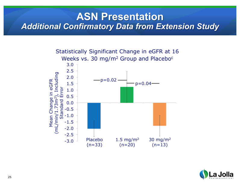- “Additional Confirmatory Data From Extension Study”; “Statistically Significant Change in eGFR at 16 Weeks vs. 30 mg/m2 Group and Placebo”