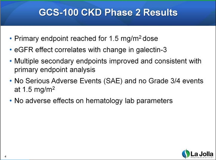 - "La Jolla Pharmaceutical Company...has completed dosing of its Phase 2 clinical trial of GCS-100 for the treatment of chronic kidney disease ('CKD') and has collected the final data for evaluation of the primary endpoint. The primary efficacy endpoint is the change in estimated glomerular filtration rate ('eGFR') from baseline to the average at Day 50 and 57 in each GCS-100 dose group compared to placebo. We look forward to analyzing the data which we expect to release in March."