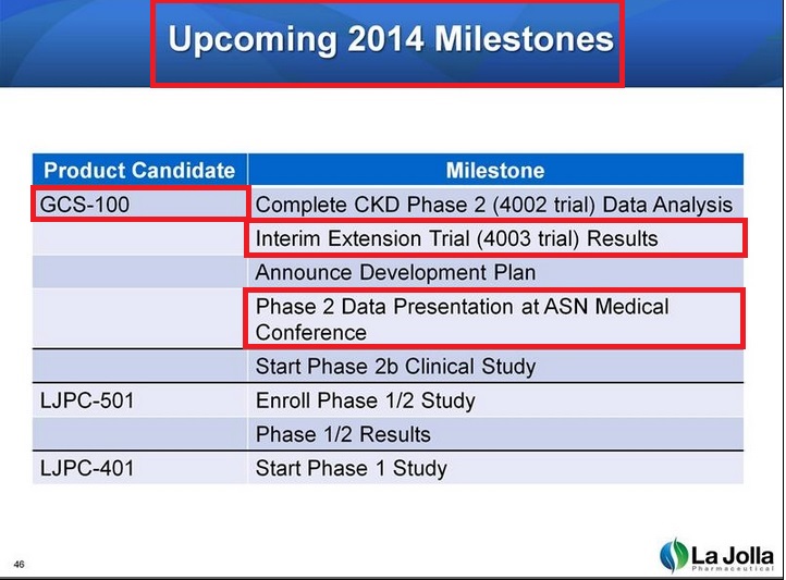 - "La Jolla Pharmaceutical Co. ( LJPC ) will be presenting an update on its phase II clinical study of GCS-100 for the treatment of chronic kidney disease at the 26th Annual ROTH Conference on March 10, 2014."