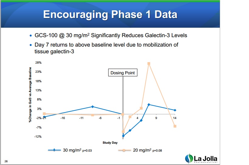 - "Encouraging Phase 1 Data"; "GCS-100 @ 30 (mg/m2) Significantly Reduces Galectin-3 Levels"; "Day 7 returns to above baseline level due to mobilization of tissue galectin-3"