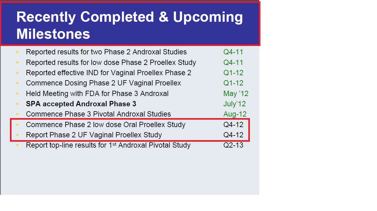 - "The Company has initiated the first clinical site for the Phase 2 low dose oral study of Proellex® in the treatment of severe endometriosis and expects to commence enrollment shortly. The Company expects to complete enrollment of the 90 subject, 4 month active dosing trial in the second quarter of 2013 and release results during the fourth quarter of that year"..."The Company has reviewed the preliminary results from the women that have completed dosing with Proellex®-V at 3, 6 and 12 mg. The 12 mg dose achieved statistically significant improvement in menstrual bleeding, uterine fibroid symptoms and reduction in fibroid volume"...