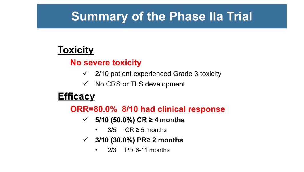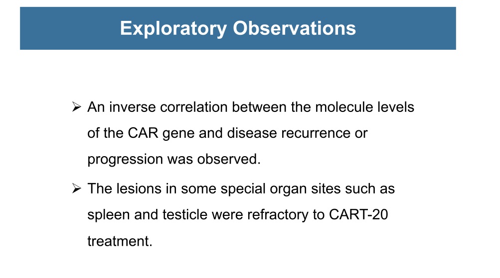 - “Summary of the Phase IIa Trial”; “Toxicity: No severe toxicity: 2/10 patient experienced Grade 3 toxicity, No CRS or TLS development”; “Efficacy: ORR=80.0% 8/10 had clinical response: 5/10 (50.0%) CR ≥ 4 months, 3/5 CR ≥ 5 months, 3/10 (30.0%) PR≥ 2 months, 2/3 PR 6-11 months”; “Exploratory Observations”; “An inverse correlation between the molecule levels of the CAR gene and disease recurrence or progression was observed”; “The lesions in some special organ sites such as spleen and testicle were refractory to CART-20 treatment”