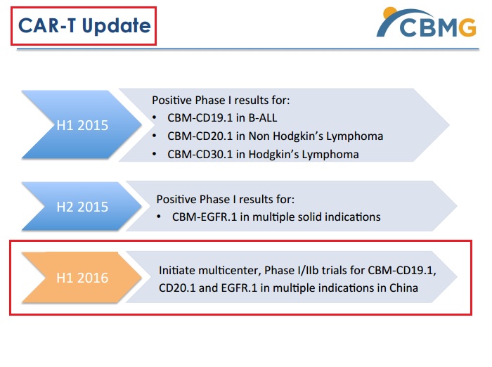 - Anticipated launch of P2 trials to study efficacy and safety of CD19 or CD20 CAR-T mono or combination therapies in chemo refractory/relapsing patients with hematological malignancies by September 2016