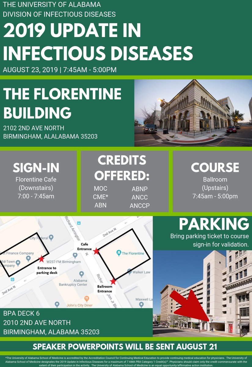 "Coming up: Join the @uabmedicine Infectious Disease Division faculty for our annual update at the historic and beautiful Florentine Building in Downtown Birmingham! @REVbham #CME @TMcCarty2010 @DoctorRachael @DrEllenEaton @AlabamaNPs @ALPublicHealth @jcdhtweets"