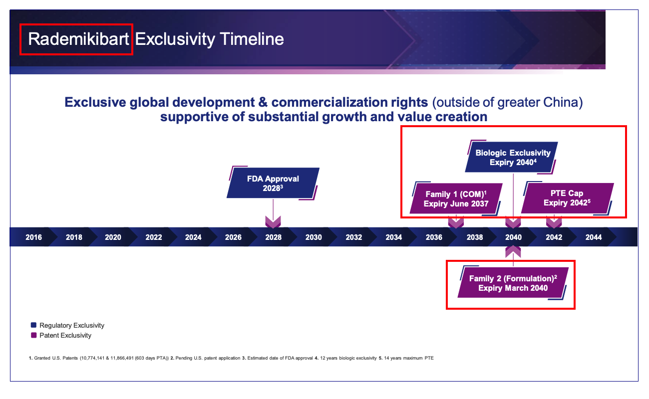 - Corporate Presentation: Expiry of patents related to formulation in March 2040; Biologic exclusivity until 2040; Patent term extension until 2042