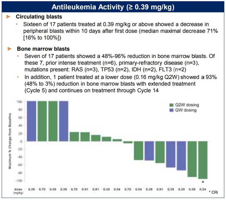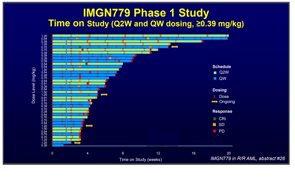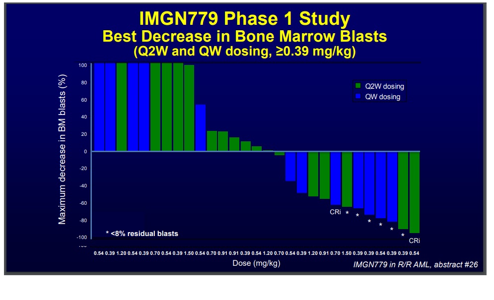 IMGN779: "Antileukemia activity was seen at doses ≥0.39 mg/kg in both schedules in seven patients with poor prognostic features"