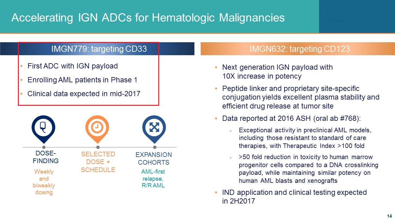 - "Preclinical data from the IMGN779 and IMGN632 programs will be presented at the ASH Annual Meeting in December, which will include an oral presentation for IMGN632. A Phase 1 trial of CD33-targeting IMGN779 in acute myeloid leukemia (AML) is ongoing with the first clinical data expected to be reported in 2017."