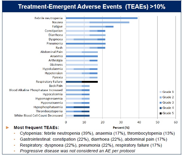 - P1; "IMGN779 continues to display manageable tolerability and antileukemia activity in patients with relapsed or refractory AML, characterized by an adverse event profile that is consistent with the underlying disease and/or comorbidity. PK exposures and PD CD33 saturation continue to increase with dose and support further escalation of both Q2W and QW dosing schedules, which is ongoing. Figure 1."