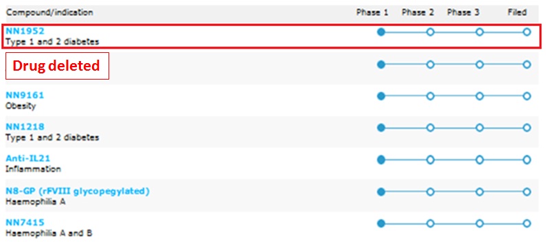 Drug removed from the pipeline for the indication type 1 and 2 diabetes