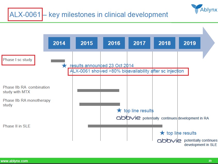 - "ALX-0061 - key milestones in clinical development"; "Phase I sc study"; "ALX-0061 showed >80% bioavailability after sc injection"