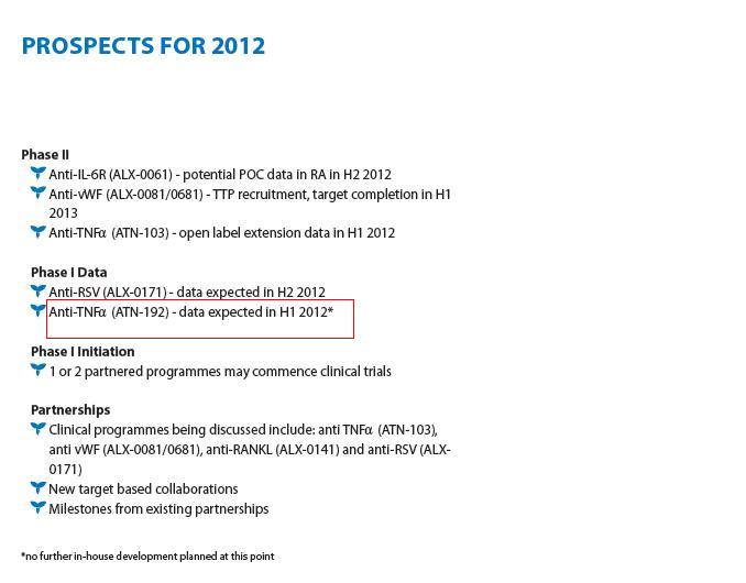 - ATN -192 / Ablynx; Anticipated data for P1 trial for RA in H1 2012