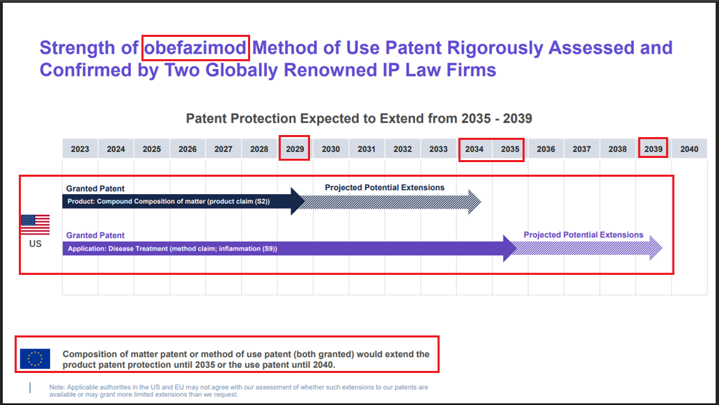 - Corporate Presentation: Patent protection in US related to disease treatment until 2035 with extension until 2039; Patent protection in EU until 2035 and protection of use patent until 2040