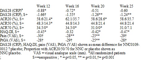 - Presentation time: Sunday, November 11; 5:45 PM; P2, N=67; NCT01282255; DAS28 was significantly decreased vs. PBO at Weeks 12 & 16, and through Weeks 12 - 25 for seropositive (RF and anti-CCP positive) pts (n=29 and 14; 3mg/kg & PBO, respectively); Significantly more NNC0109-0012 treated seropositive pts vs. PBO achieved ACR20/50 at Wk 12 & ACR70 at Wks 12, 16 & 20