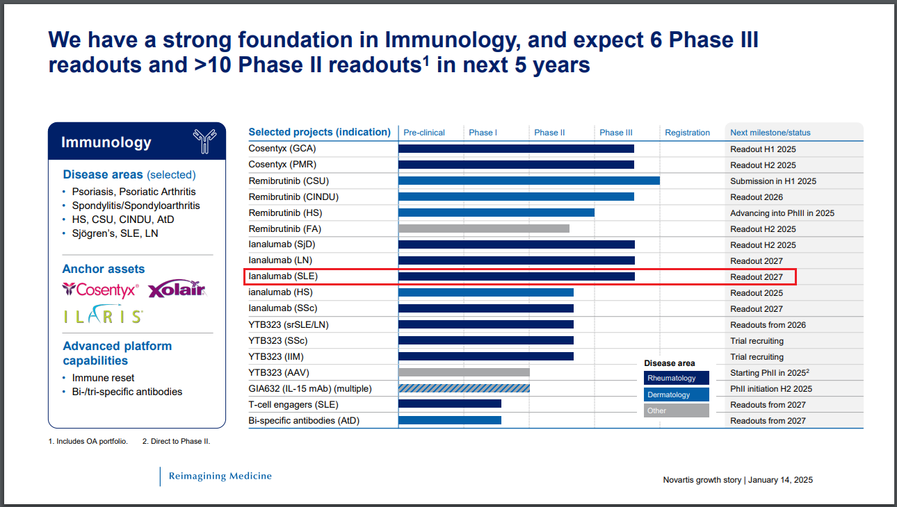 - "Novartis plans to submit to health authorities globally in early 2026...Numerical improvements were observed as early as Week 16, which were sustained throughout the study. Patients receiving ianalumab showed consistent numerical improvements in secondary outcome measures including: More patients with ESSDAI low disease activity; Improvement in Physician Global Assessment; Reduction in overall disease burden as early as Week 8 continuing to Week 52 as assessed by Patient Global Assessment; Numerical improvement in dryness, pain and fatigue as assessed by Sjögren’s Syndrome Symptom Diary and EULAR Sjögren’s Syndrome Patient Reported Index; Improvement of stimulated Salivary Flow (sSF) rate and oral dryness vs placebo in patients with sSF>0.4 mL/min at baseline, in a post-hoc analysis."
