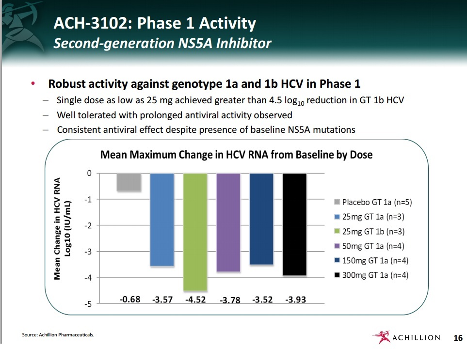 - "ACH-3102: Phase 1 Activity Second-generation NS5A Inhibitor"; "Robust activity against genotype 1a and 1b HCV in Phase 1"; "Single dose as low as 25 mg achieved greater than 4.5 log10 reduction in GT 1b HCV"; "Well tolerated with prolonged antiviral activity observed"; "Consistent antiviral effect despite presence of baseline NS5A mutations"