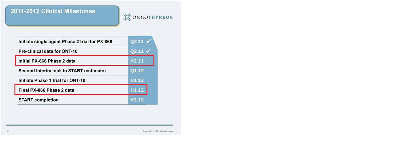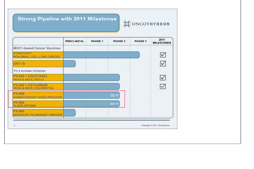 / Oncothyreon; Initiation of single agent P2 trials expected in Q2 ’11 & P2 data expected in H2 ’11 & H1 ’12; Anticipated trials for chemotherapy naive prostrate & glioblastoma in Q2