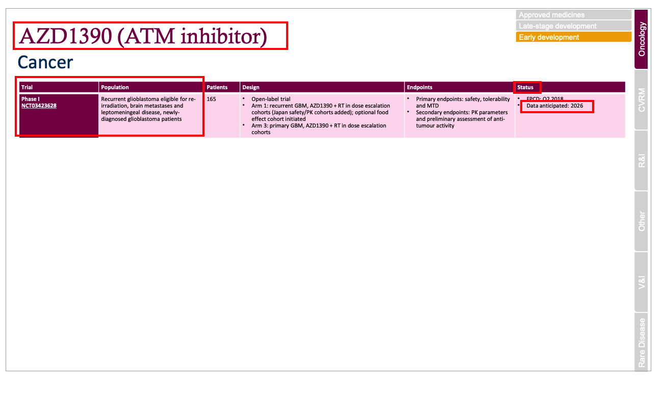 AZD1390: Data from P1 trial (NCT03423628) for brain metastases and newly diagnosed glioblastoma in H2 2026