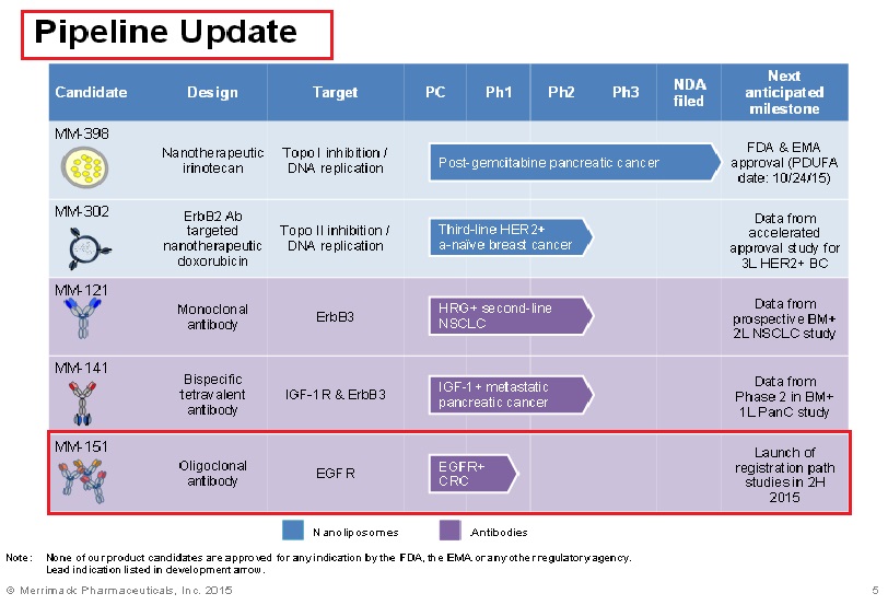 - "Merrimack anticipates the following milestones in 2015: [1] Initiation of a clinical trial of MM-151 in EGFR-positive colorectal cancer; [2] Continued enrollment in HERMIONE, a Phase 2 clinical trial...[of] MM-302 in patients with HER2-positive metastatic breast cancer; [3] Continued enrollment in a Phase 2 clinical trial of MM-121 in patients with [mNSCLC]; and