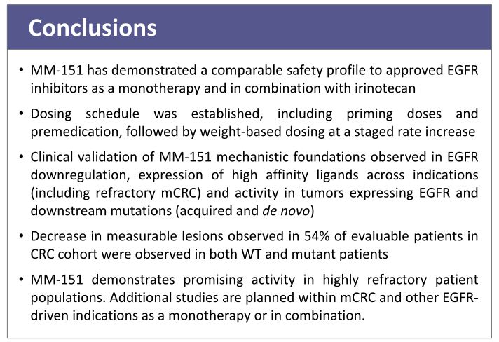 - "MM-151 has demonstrated a comparable safety profile to approved EGFR inhibitors as a monotherapy and in combination with irinotecan"; "Dosing schedule was established, including priming doses and premedication, followed by weight-based dosing at a staged rate increase"; "Clinical validation of MM-151 mechanistic foundations observed in EGFR downregulation, expression of high affinity ligands across indications (including refractory mCRC) and activity in tumors expressing EGFR and downstream mutations (acquired and de novo)"; "Decrease in measurable lesions observed in 54% of evaluable patients in CRC cohort were observed in both WT and mutant patients"; "MM-151 demonstrates promising activity in highly refractory patient populations. Additional studies are planned within mCRC and other EGFR-driven indications as a monotherapy or in combination"