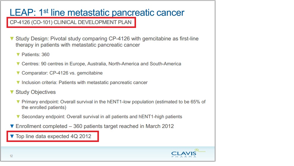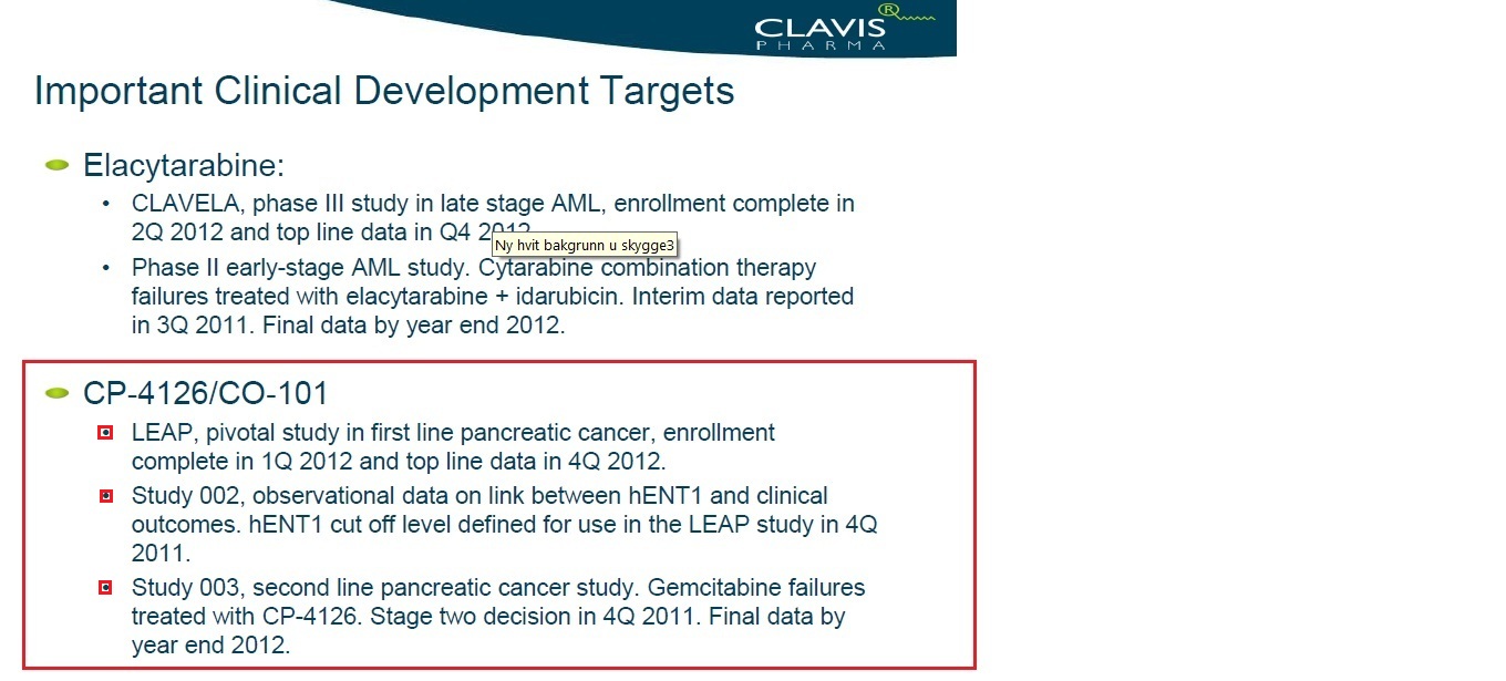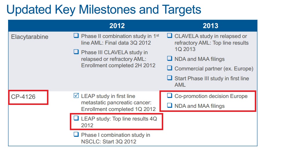 - CO-101 / Clavis; Anticipated top-line data from P2 LEAP study in 1st line metastatic pancreatic cancer in Q4 2012; Anticipated European co-promotion decision in 2013; Anticipated NDA filing in 2013; Anticipated MAA filing in 2013