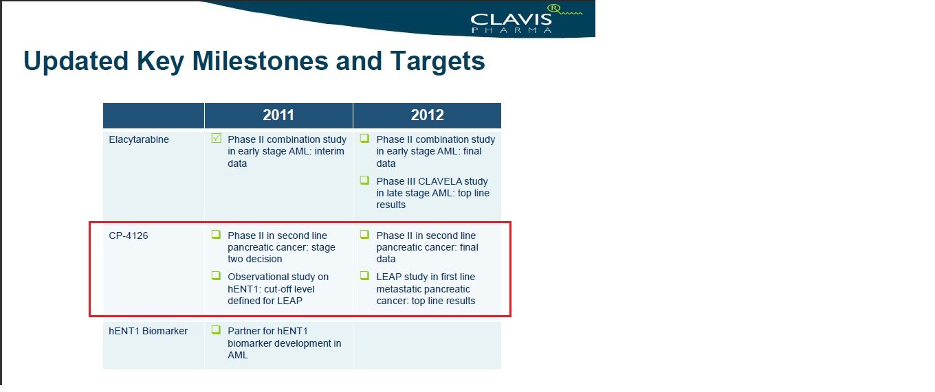 - CP-4126(CO-101) / Clavis; Anticipated enrollment completion of LEAP study, pivotal study in pancreatic cancer in Q1 2012; Anticipated top line data of LEAP study, pivotal study in pancreatic cancer by end of 2012; Anticipated hENT1 biomarker study data in Q4 2011; Anticipated stage two decision of P2 study for second-line refractory pancreatic cancer in Q4 2011; Anticipated final data of P2 study for second-line refractory pancreatic cancer by year end 2012