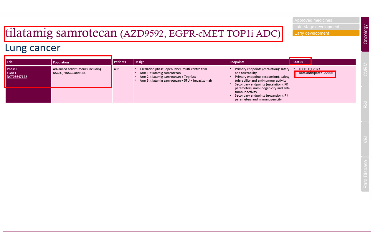 - "Two posters will feature AZD9592, an EGFR/cMET bispecific ADC designed to deliver targeted chemotherapy to cancer cells expressing both EGFR and cMET with a topoisomerase inhibitor 1 warhead using the Company’s proprietary linker technology. A trial-in-progress poster will describe the EGRET Phase I trial, a first-in-human study evaluating AZD9592 in patients with advanced solid tumours including in combination with Tagrisso in metastatic EGFRm NSCLC. In addition, a poster on translational results for AZD9592 suggests it may provide clinical benefit in areas of unmet need, including in patients with NSCLC previously treated with chemotherapy or targeted agents."
