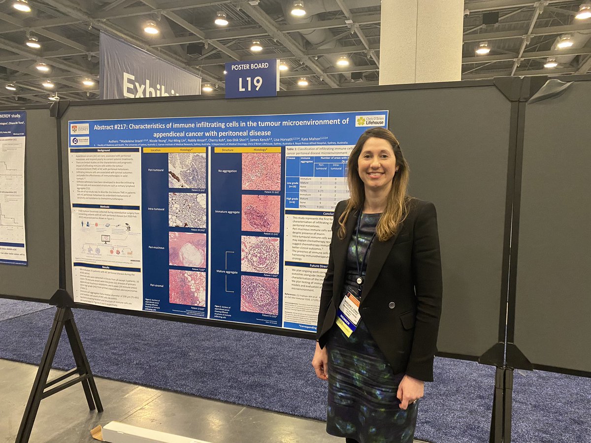 "Pleased to show our poster on peritoneal immune cell infiltrates 🔬 in #appendixtumours at #GI23 @ASCO @COBLH @GarvanInstitute"
