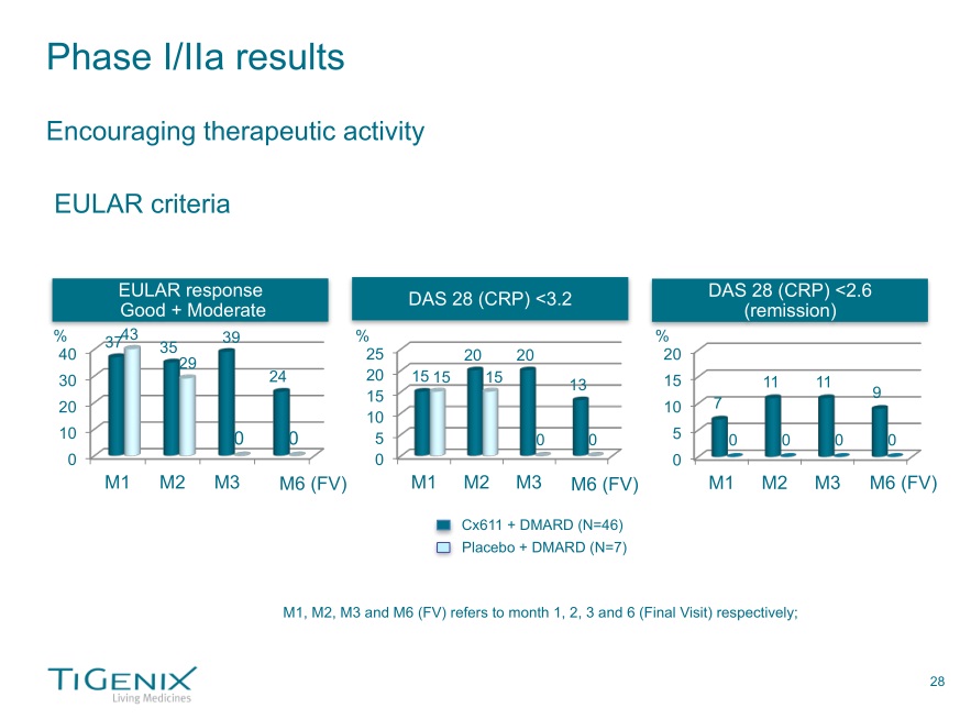 - “Favorable safety profile of all three doses of Cx611”; “Only on patient experienced a serious adverse event leading to discontinuation of the treatment, All other side effects were mild and transient: most common related adverse events in the Cx611+DMARD group: fever (15%), headache (9%), asthenia (6%)”; “Encouraging therapeutic activity”