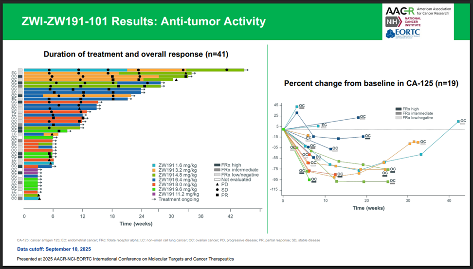 - "Preliminary efficacy data, combined with a tolerable safety profile, reinforce the potential of ZW191 in patients with advanced solid tumors, including ovarian, endometrial, and non-small cell lung cancer. 64% overall response rate in gynecological cancers at doses ≥6.4mg/kg. Responses observed at all doses evaluated at 3.2mg/kg....Dose optimization of ZW191 in ovarian cancer to initiate in 4Q-2025."
