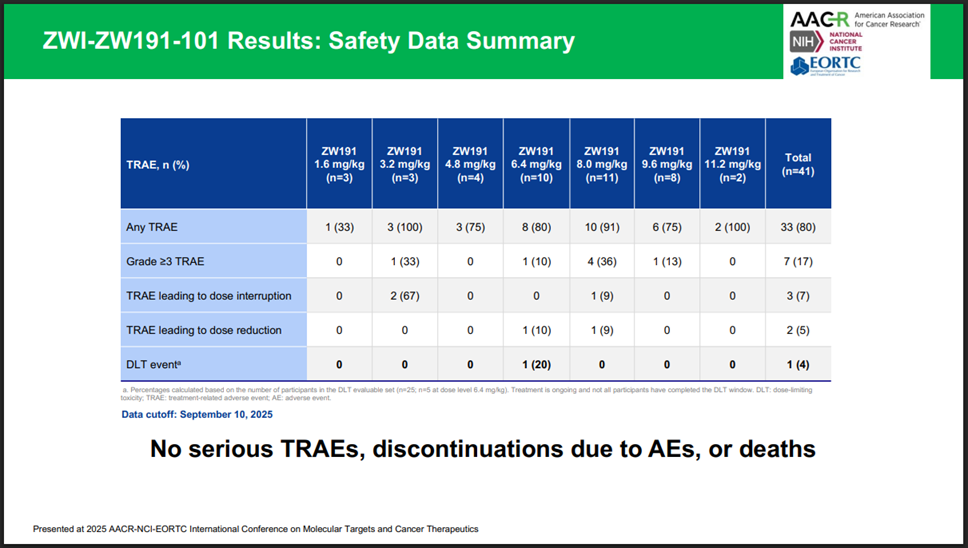 - P1 | "ZW191 has been safely administered during dose escalation up to 9.6 mg/kg and has demonstrated preliminary efficacy across multiple dose levels, starting at 3.2mg/kg Q3W. Part 1 dose escalation is ongoing."