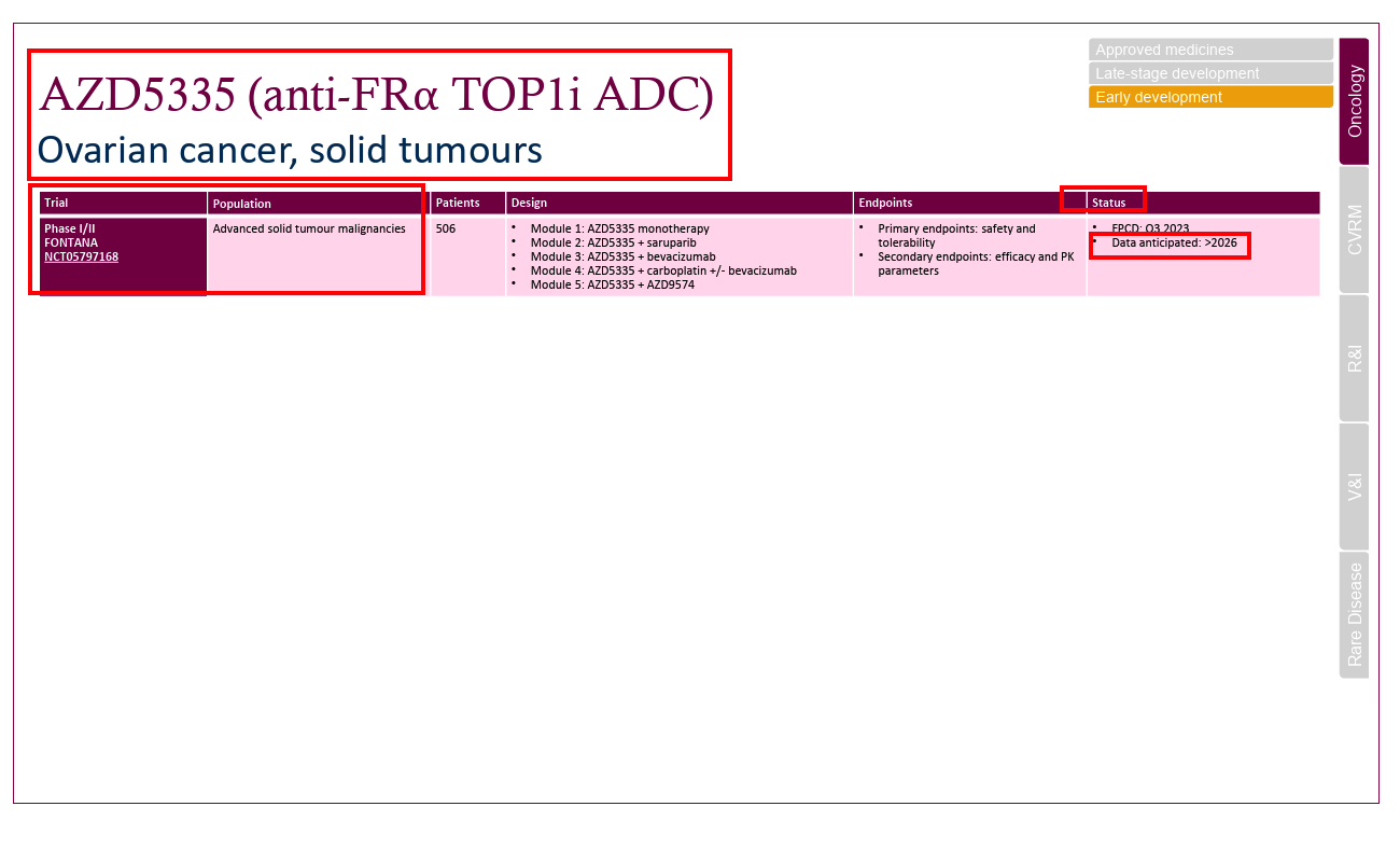 - "AZD5335, an FRα-targeting antibody conjugated to a topoisomerase 1 inhibitor (TOP1i) payload, is currently being investigated in the FONTANA Phase I/IIa clinical trial (NCT#05797168), either as a single agent or in combination with a PARP1-selective inhibitor (saruparib). A series of in vitro studies will also define the ADC/SOC drug interactions and further delineate underlying mechanisms driving enhanced efficacy. These studies inform our ongoing clinical development of AZD5335 in ovarian cancer."