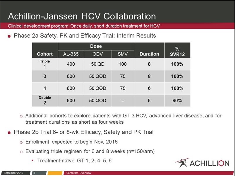 Achillion announces 100% SVR reported in Janssen's phase 2a trial evaluating triple combination of odalasvir, AL-335, and simeprevir for genotype 1 treatment-naive HCV